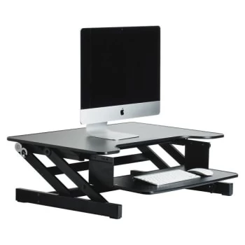 - Lorell Black Desktop Sit-Stand Workstation, offers a healthy addition to any desk that allows you to sit or stand while you work. The large, 31″ x 20″ work surface accommodates two monitors or a monitor and a laptop. Ergonomic keyboard tray moves up and down with the desk and moves out/in for the most comfortable position. Five height adjustments (up to over 16″ above your desk) allow a comfortable standing position. Gas spring will allow you to easily move the desk up and down, even with your computer equipment. Riser is fully assembled for use right out of the box.
